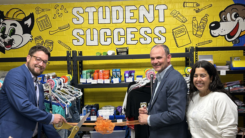 Company leaders join the Columbus Crew and Student Success Stores to celebrate the grand opening of the newest Student Success Store at West High School. The store provides students with basic needs items free of charge.