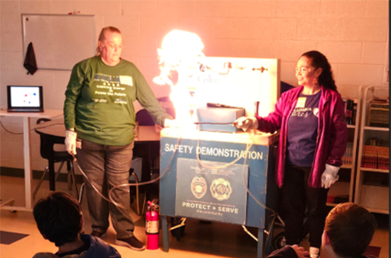 Columbia team members offer a controlled gas safety demonstration and share STEM and gas safety education materials with students